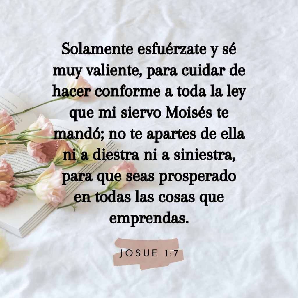 Solamente sé fuerte y muy valiente. Cuídate de cumplir toda la ley que Moisés Mi siervo te mandó. No te desvíes de ella ni a la derecha ni a la izquierda, para que tengas éxito dondequiera que vayas. Josué 1:7