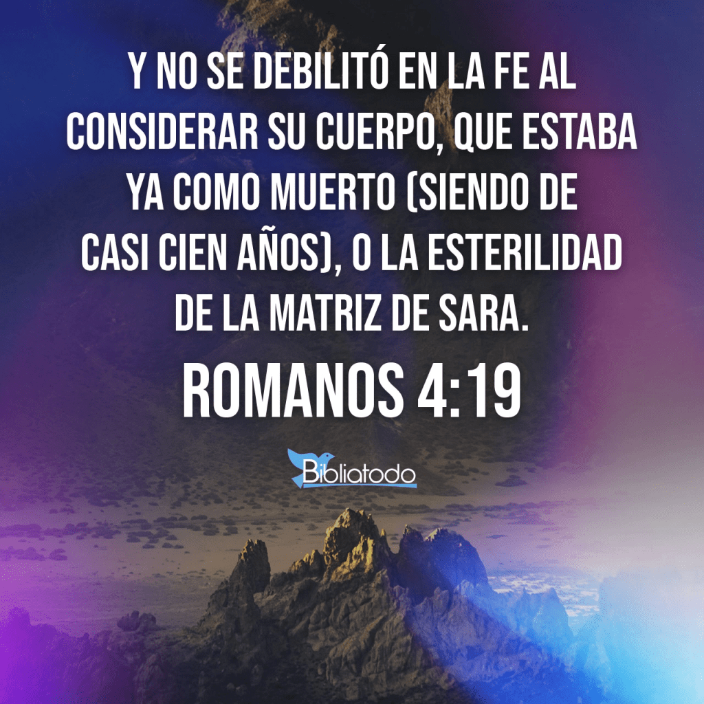 "Y no se debilitó en la Fe al considerar su cuerpo, que estaba ya como muerto (siendo de casi cien años), o la esterilidad de la matriz de Sara. Tampoco dudó, por incredulidad, de la promesa de Dios, sino que se fortaleció en Fe, dando gloria a Dios, plenamente convencido de que era también poderoso para hacer Todo lo que había prometido". Romanos 4:19-22.
