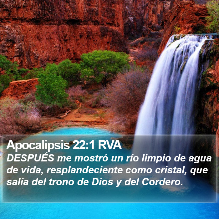 "El río de agua de vida", no surgió de la tierra, ¡sino de del Trono de Dios y del Cordero! ¡Cuyas aguas vivificantes de amor y gracia de Dios dan salvación al pecador! "Porque sin derramamiento de Sangre no hay perdón" Heb. 9:22. La Sangre de Cristo, fue prefigurada, "en el hermoso río que regaba el huerto del Edén", Gén. 2:10. En el río de Dios que fluye del templo, visto por el profeta Ezequiel, manantial salutífero que sana el alma de todo aquel que por la Fe se sumerge en él: ¡Todo lo que entre en este río vivirá! Ezeq. 47:9. Y profetizada por Zacarías 13:1: "En aquel día habrá una fuente abierta para lavar el pecado y la impureza". Que el Espíritu Santo de Dios te revele el infinito y eterno amor de Dios por ti y por mi; ¡y luego anhela sumergirte y bucear en este río de vida, que sale del trono de Dios y del Cordero!