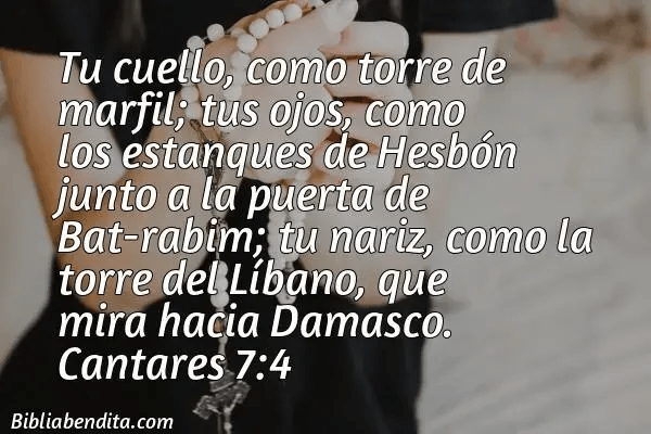 El Esposo, Cristo, en este capítulo está elogiando la belleza de los miembros del cuerpo de Su esposa, la iglesia, cada alma fiel, y nosotros somos miembros del cuerpo de Cristo, aunque siendo muchos formamos un solo cuerpo en Cristo. Rom. 12:5 y 1Cor. 12:12. El SEÑOR ve a la Iglesia incorporada a Él y habla de manera específica de la profunda hermosura de los ojos de la esposa: "Tus ojos, como los estanques de Hesbón". La amada tuvo que pasar por mucho, el proceso ha sido intenso desde que entregó su vida a Cristo, se consagró totalmente a Él, se apartó de los malos deseos del cuerpo, la codicia de los ojos y la vanagloria de la vida. 1 Juan 2:16. Hasta ser hecha conforme a la imagen de su Cristo, Rom.8:29.