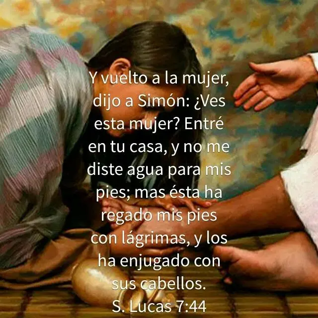 Y vuelto a la mujer, dijo a Simón: ¿Ves esta mujer? Entré en tu casa, y no me diste agua para mis pies; mas ésta ha regado mis pies con lágrimas, y los ha enjugado con sus cabellos. No me diste un beso; mas ésta, desde que entré, no ha cesado de besar mis pies. No ungiste mi cabeza con aceite; mas ésta ha ungido con perfume mis pies. Lucas 7:44-46