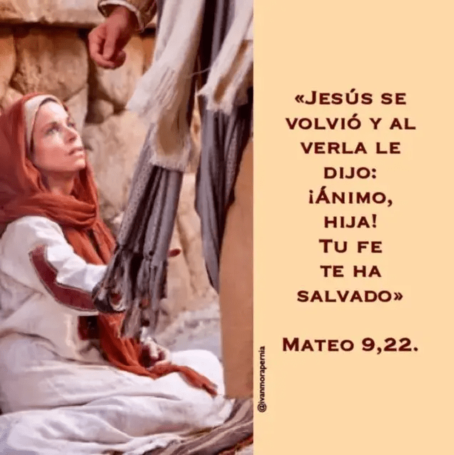 Y he aquí una mujer enferma de flujo de sangre desde hacía doce años, se le acercó por detrás y tocó el borde de su manto; porque decía dentro de sí: "Si tocare solamente su manto, seré salva." Pero Jesús, volviéndose y mirándola, dijo: "Ten ánimo, hija; tu fe te ha salvado." Y la mujer fue salva desde aquella hora. Mateo 9:20-22