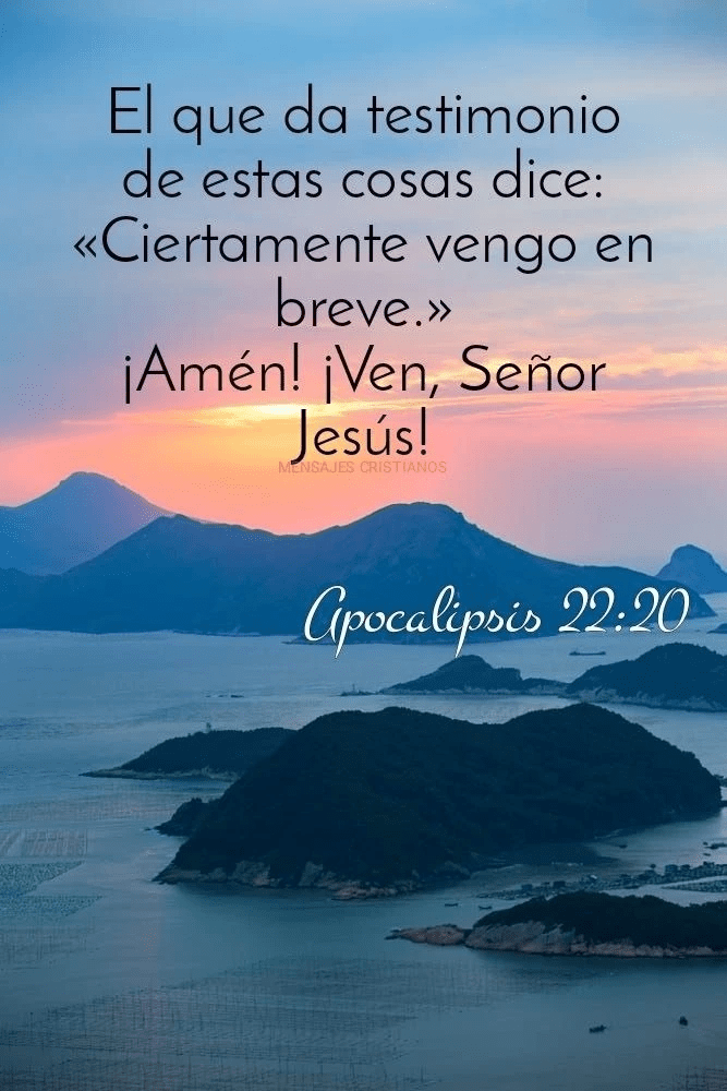 El que da testimonio de estas cosas dice: «Ciertamente, vengo pronto.» Amén. ¡Ven, Señor Jesús! Apocalipsis 22:20