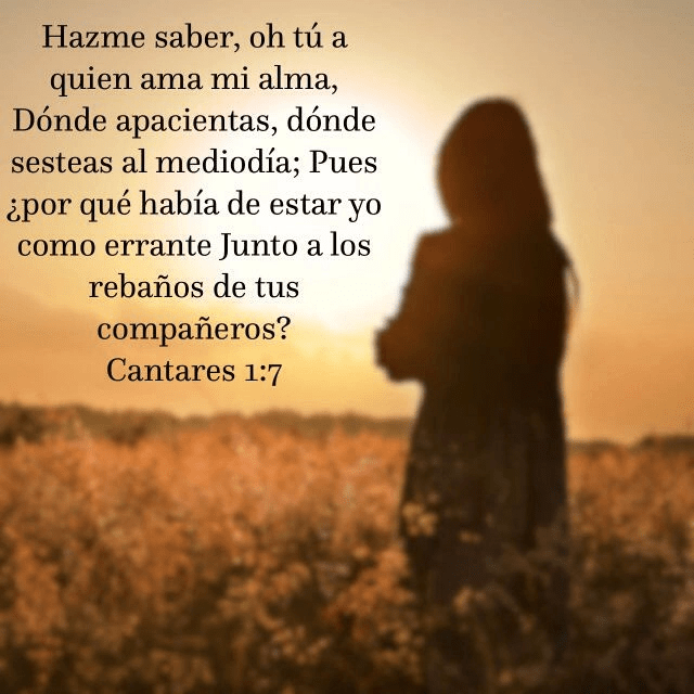 Dime, amado de mi alma: ¿Dónde apacientas tu rebaño? ¿Dónde lo haces descansar al mediodía? ¿Por qué he de ser yo como una que se cubre con velo Junto a los rebaños de tus compañeros?». Cantares 1:7