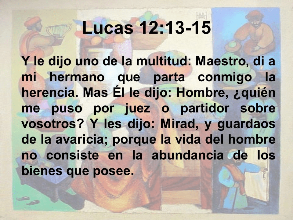 "Entonces le dijo uno del pueblo: "Maestro, di a mi hermano que me de la parte que me toca de la herencia". Hombre, ¿quién me ha puesto como juez o partidor entre ustedes? También dijo: "Cuídense ustedes DE TODA AVARICIA; porque la vida del hombre no depende de los muchos bienes que posea." Lucas 12:13-15