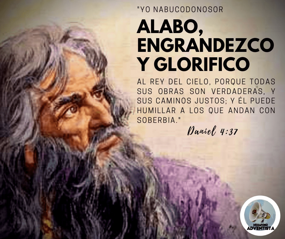 Pero al fin del tiempo yo, Nabucodonosor, levanté mis ojos al cielo, y mi entendimiento volvió a mí; y bendije al Altísimo y alabé y glorifiqué al que vive para siempre. . . Él hace según su voluntad en el ejército del cielo y entre los habitantes de la tierra. . .En el mismo tiempo me fue devuelta la razón y mi dignidad . . . Fui restaurado a mi reino. . . Ahora, yo, Nabucodonosor, alabo, exalto y glorifico al Rey de los cielos, porque todas sus obras son verdad y sus caminos son justicia. Él puede humillar a los que andan con soberbia”. . Daniel 4: 34-37