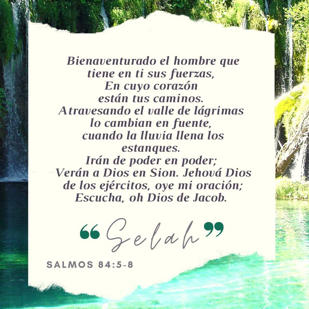 "Bienaventurado el hombre que tiene en ti sus fuerzas, En cuyo corazón están tus caminos. Atravesando el valle de lágrimas lo cambian en fuente, Cuando la lluvia llena los estanques. Irán de poder en poder; hasta llegar a verte, oh Dios, en Sión. ". Salmo 84: 5-7