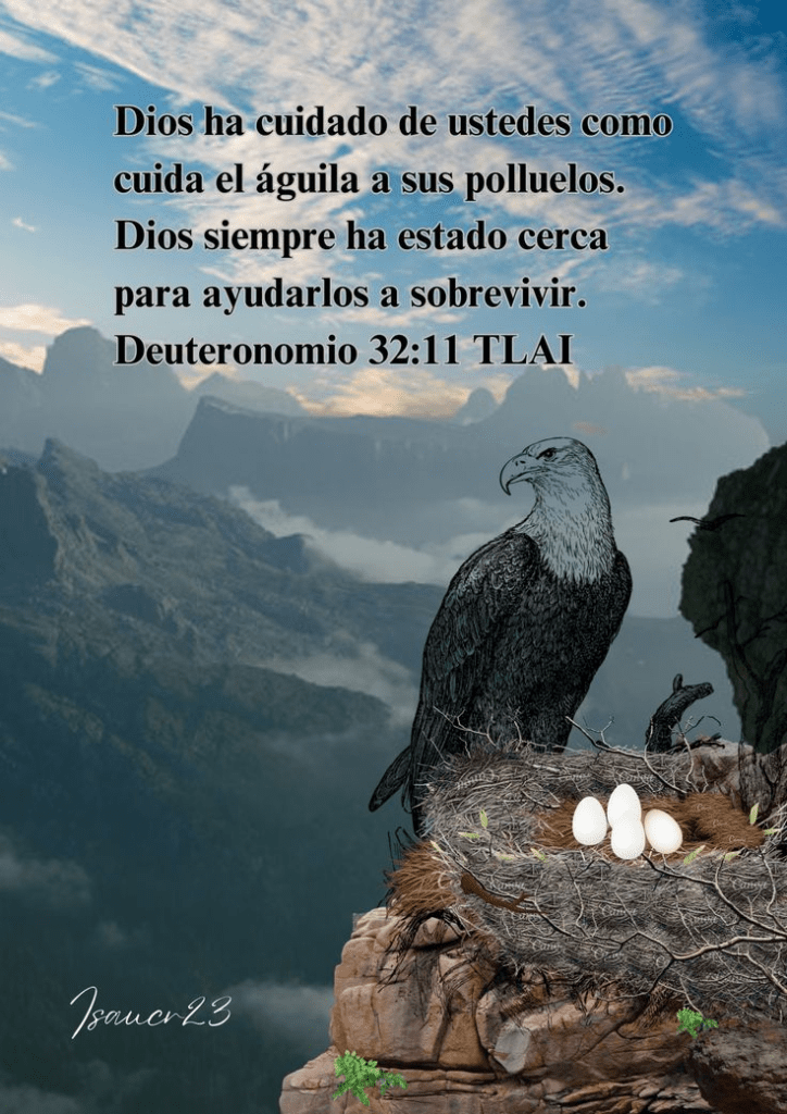 "Como un águila que despierta su nidada, Que revolotea sobre sus polluelos, Extendió Sus alas y los tomó, Los llevó sobre Su plumaje". Deuteronomio 32:11