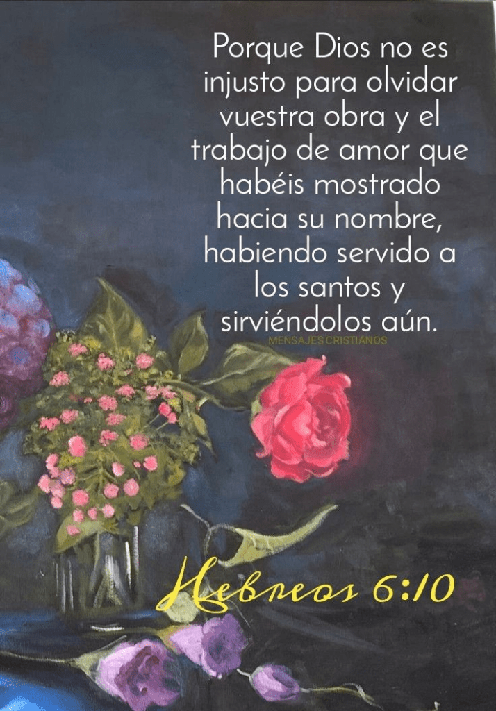 Porque Dios es justo, y no olvidará el trabajo de ustedes y el amor que han mostrado hacia él mediante el servicio a los santos, como hasta ahora lo hacen. Hebreos 6:10