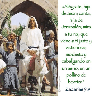 Alégrate mucho, ciudad de Sion; he aquí tu rey viene a ti, justo, y salvador, humilde, y cabalgando sobre un asno, sobre un pollino hijo de asna. Zacarías 9:9