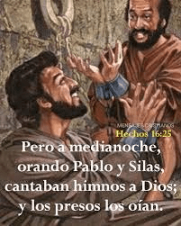 A medianoche, Pablo y Silas oraban y cantaban himnos a Dios, y los presos los escuchaban. Hechos 16:25