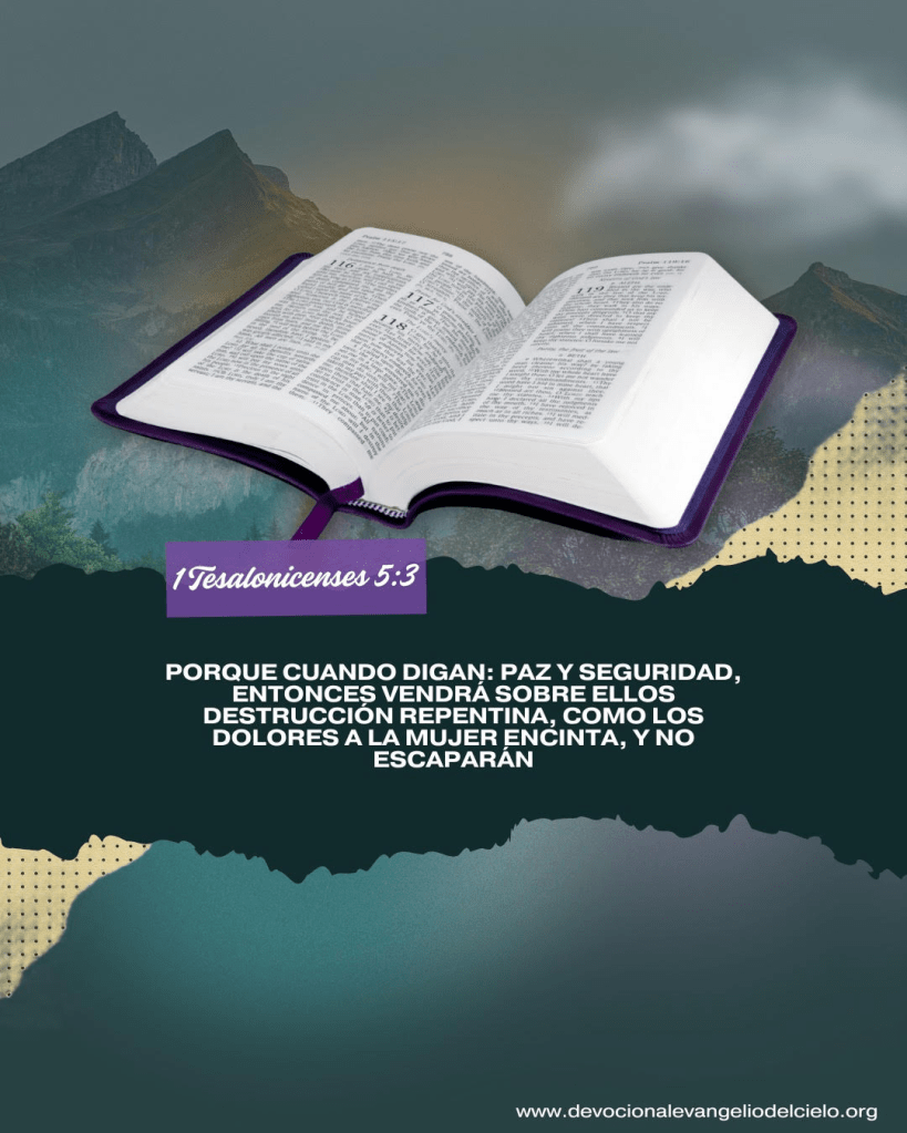 «Porque cuando digan: Paz y seguridad, entonces vendrá sobre ellos destrucción repentina, como los dolores a la mujer encinta, y no escaparán». 1 TESALONICENSES 5:3