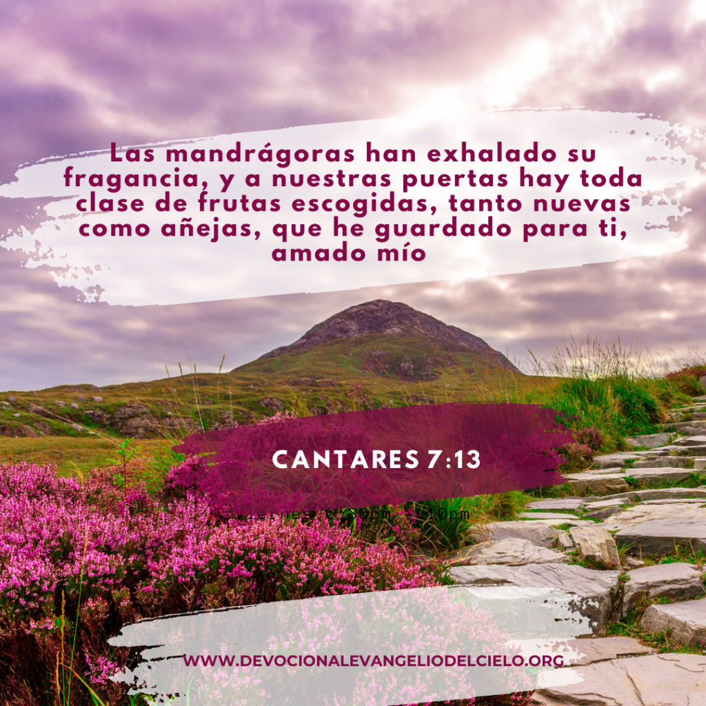 📖 “Las mandrágoras han exhalado su fragancia, y a nuestras puertas hay toda clase de frutas escogidas, tanto nuevas como añejas, que he guardado para ti, amado mío.”
