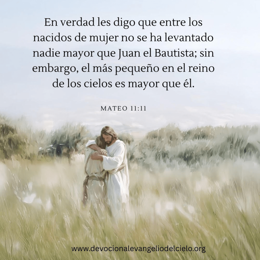 Este versículo pronunciado por Jesús es profundamente revelador: a pesar de la grandeza de Juan el Bautista, el más pequeño en el Reino de los cielos lo supera. ¿Por qué? Porque los nacidos de nuevo, quienes han sido regenerados por el Espíritu y han entrado en el Nuevo Pacto por medio de Cristo, poseen privilegios que ni el más grande profeta del Antiguo Testamento experimentó plenamente.