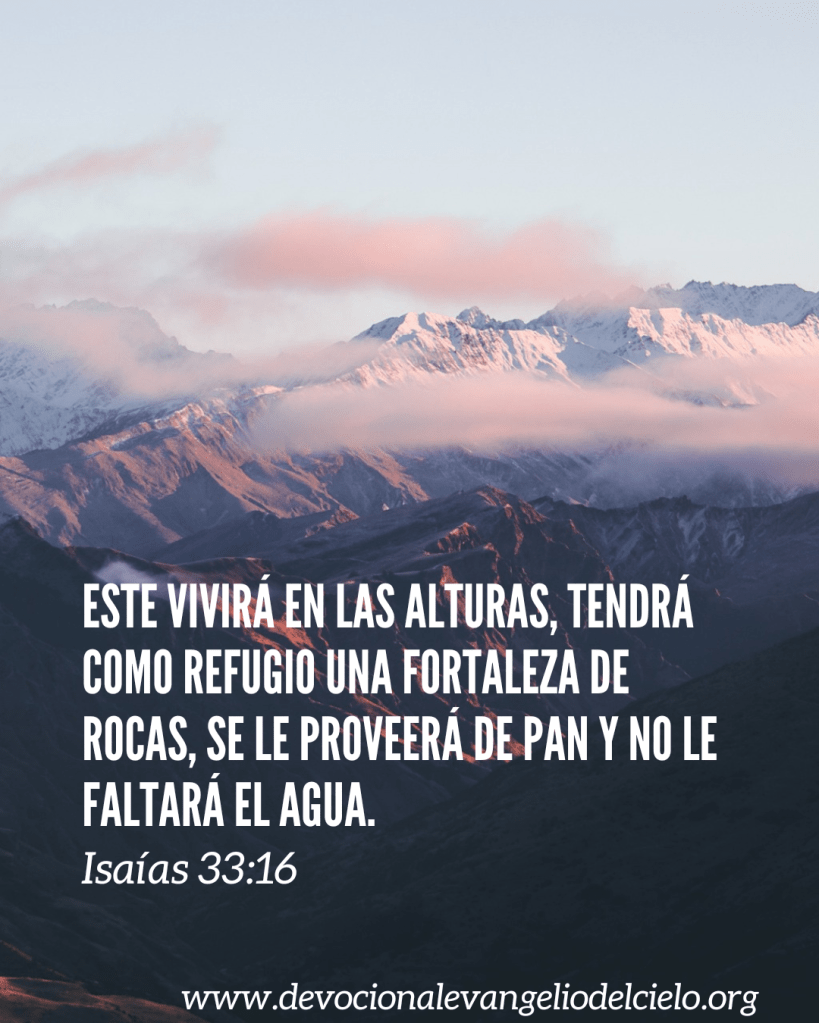 Este vivirá en las alturas, tendrá como refugio una fortaleza de rocas, se le proveerá de pan y no le faltará el agua. Isaías 33:16